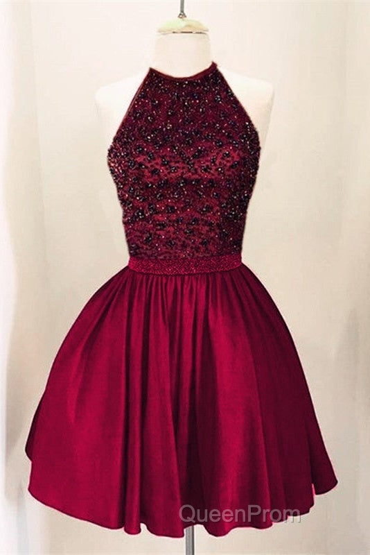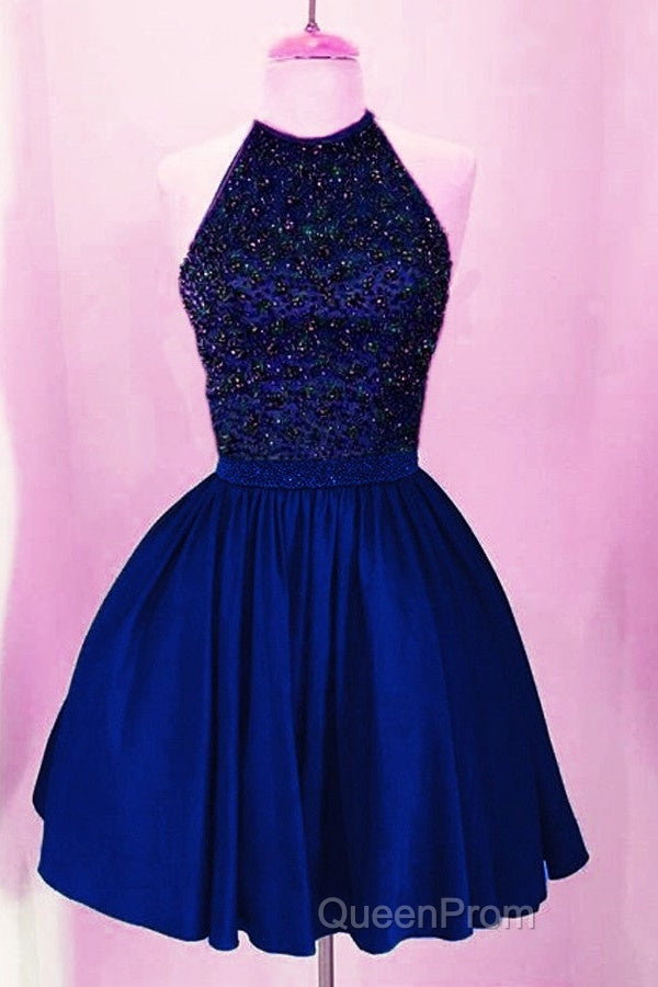 A-Line Beaded Halter Keyhole Back Satin Homecoming Dresses Short