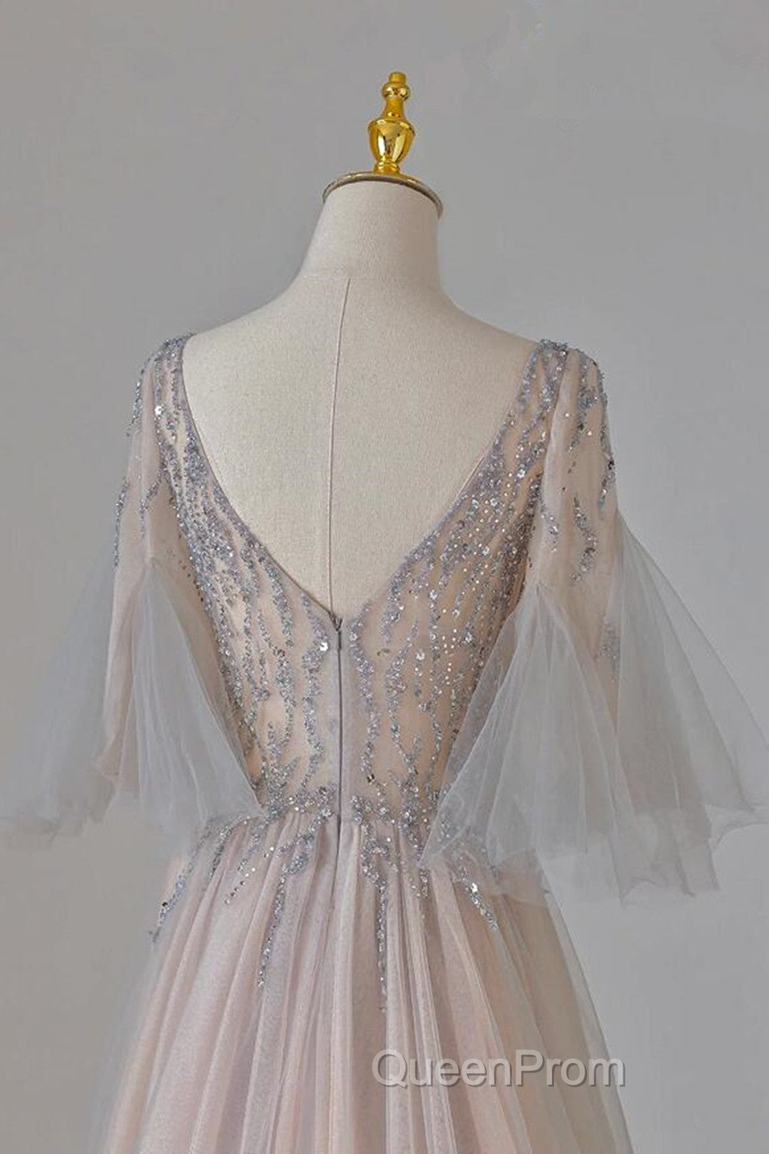 A-Line Beaded V-Neckline Tulle Formal Dresses, Puffy Sleeves Long Evening Prom Dresses