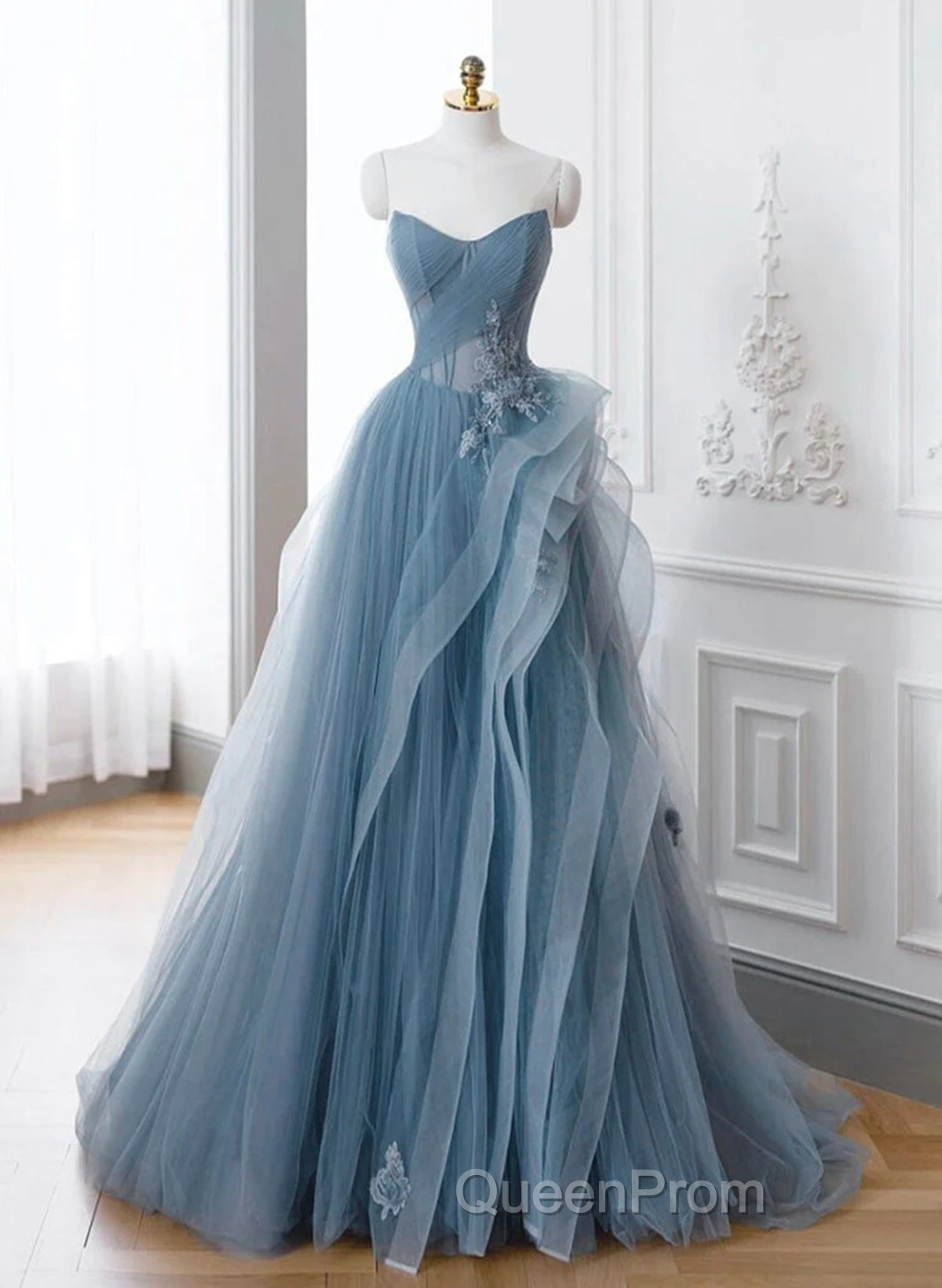 A-Line Blue Tulle Long Party Dresses With Lace, Off Shoulder Tulle Evening Prom Dresses