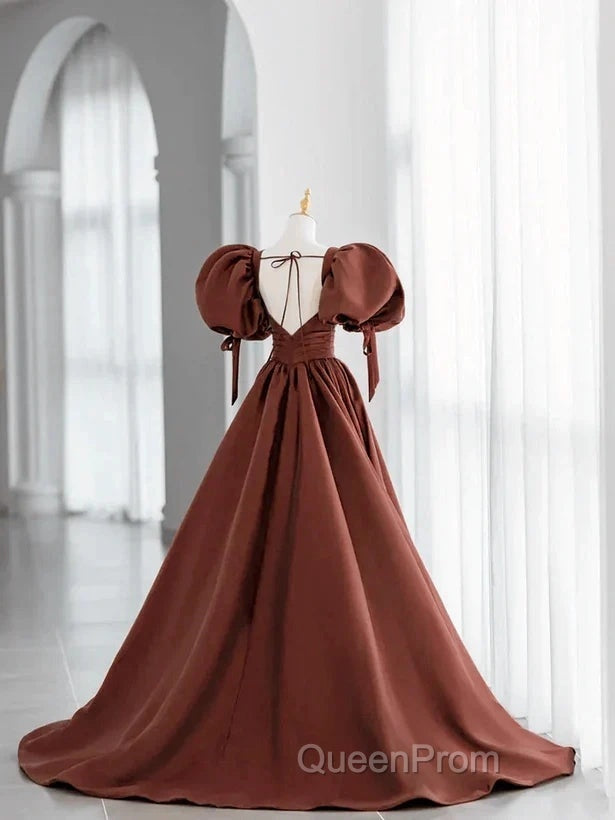 A-Line Brown Satin Ball Gown Short Sleeves Long Party Dresses V-Neckline Evening Prom Dresses