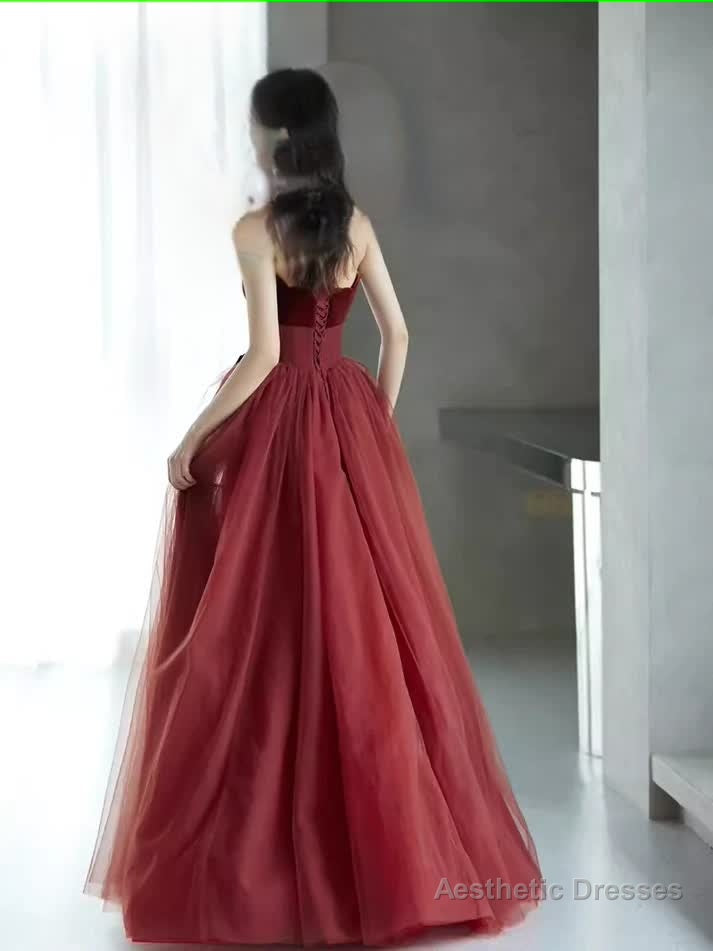 A line Burgundy Strapless Prom Dresses Evening Dress