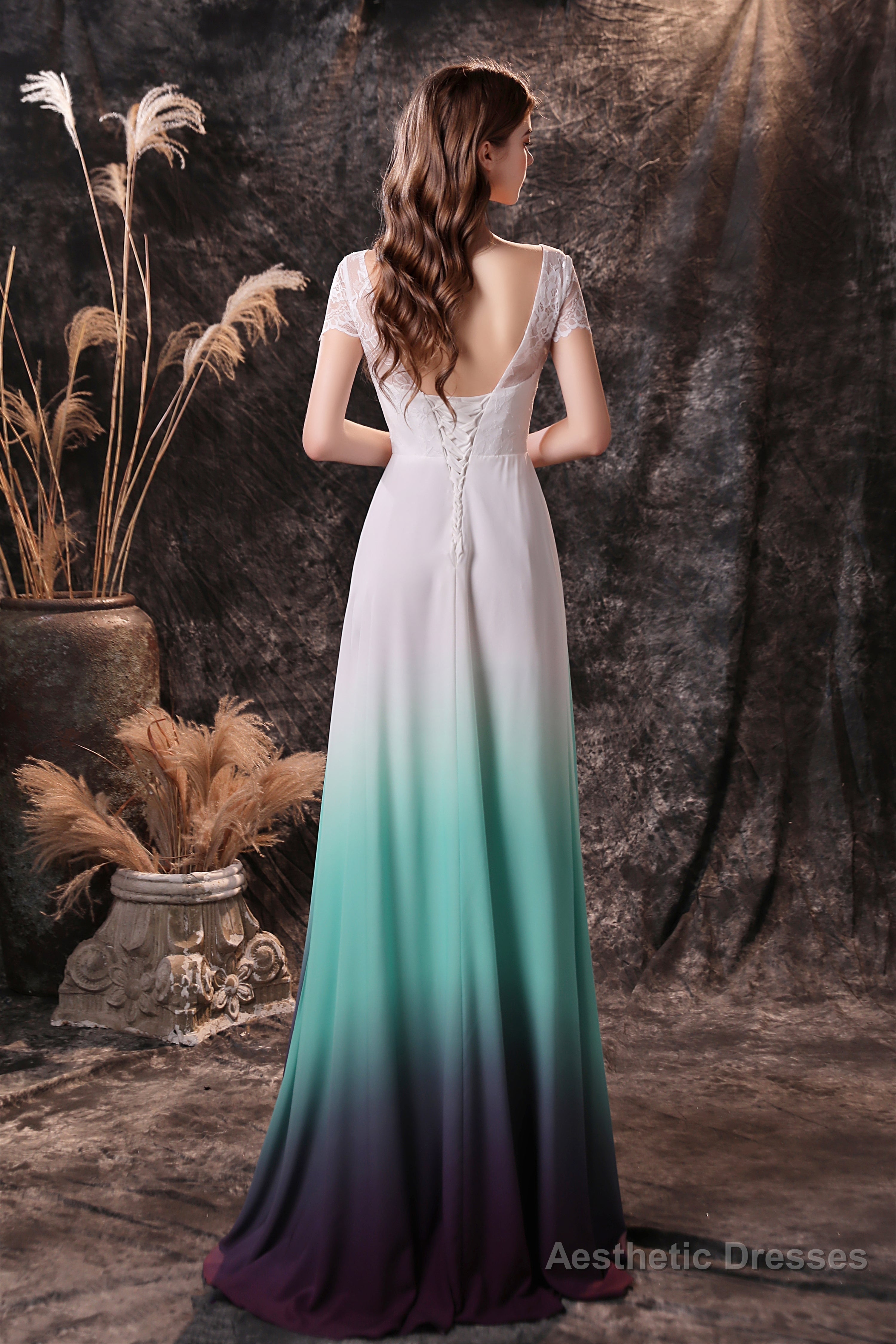 A Line Cap Sleeve Ombre Silk Floor Length Prom Dresses