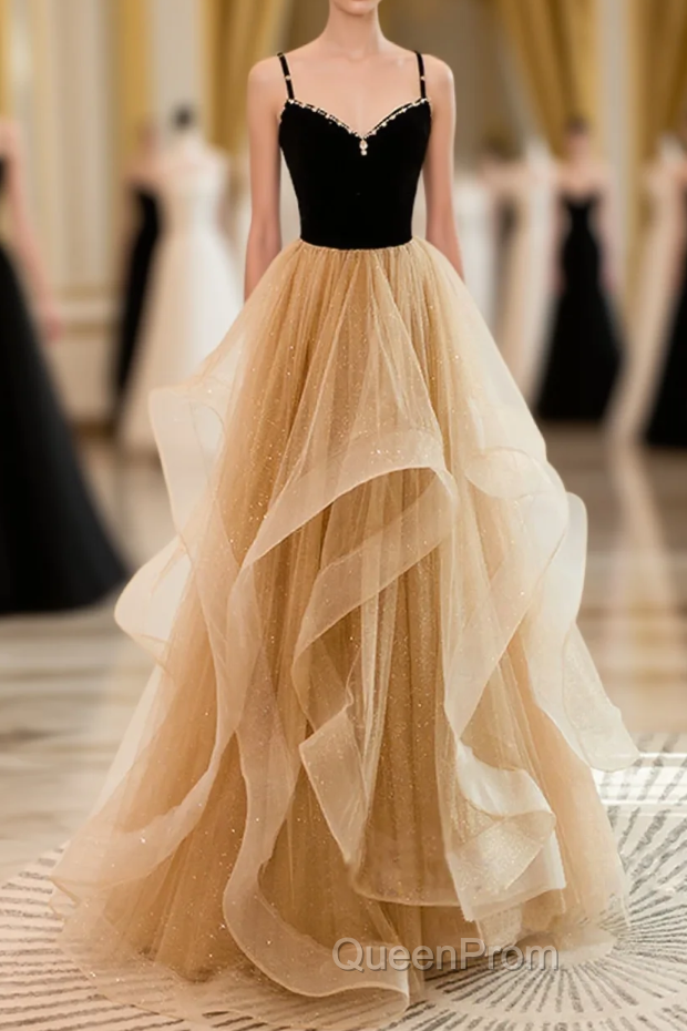 A-Line Champagne Tulle Sweetheart Beaded Long Evening Prom Dresses, Tulle Layers Party Dresses