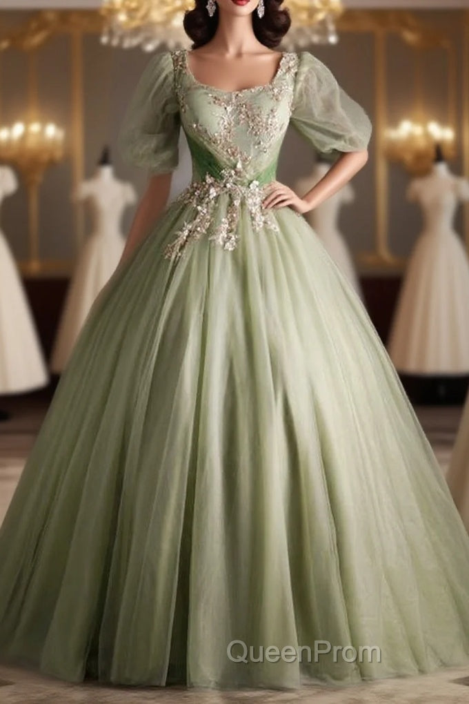 A Line Green Applique Evening Prom Dresses Sweet Tulle Birthday Party Dresses