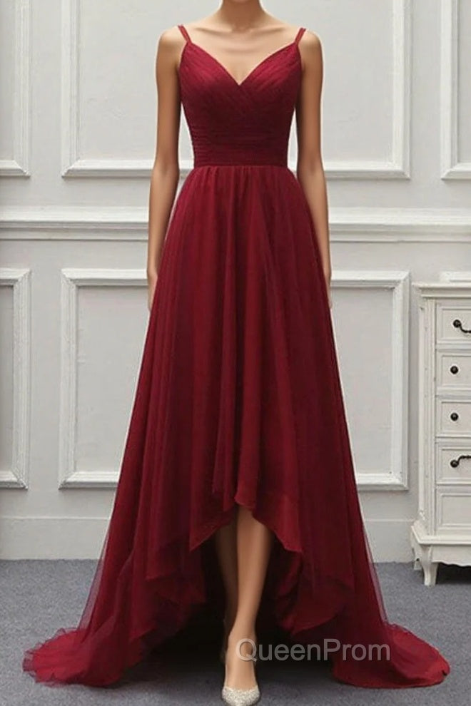 A Line High Low Tulle Evening Prom Dresses with Train, Burgundy V Neck Backless Formal Dresses