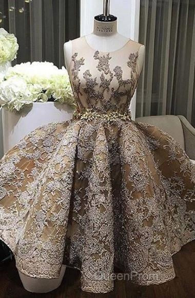 A-Line Jewel Sleeveless Short Evening Prom Dresses With Lace Appliques
