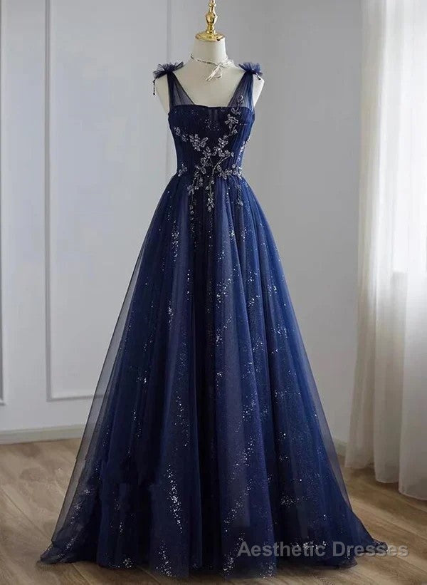 A-Line Princess Navy Blue Tulle Beaded V-neckline Party Dress Shiny Tulle Prom Dress