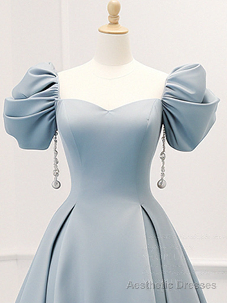 A-Line Puff Sleeves Satin Blue Long Prom Dress, Blue Long Formal Dress