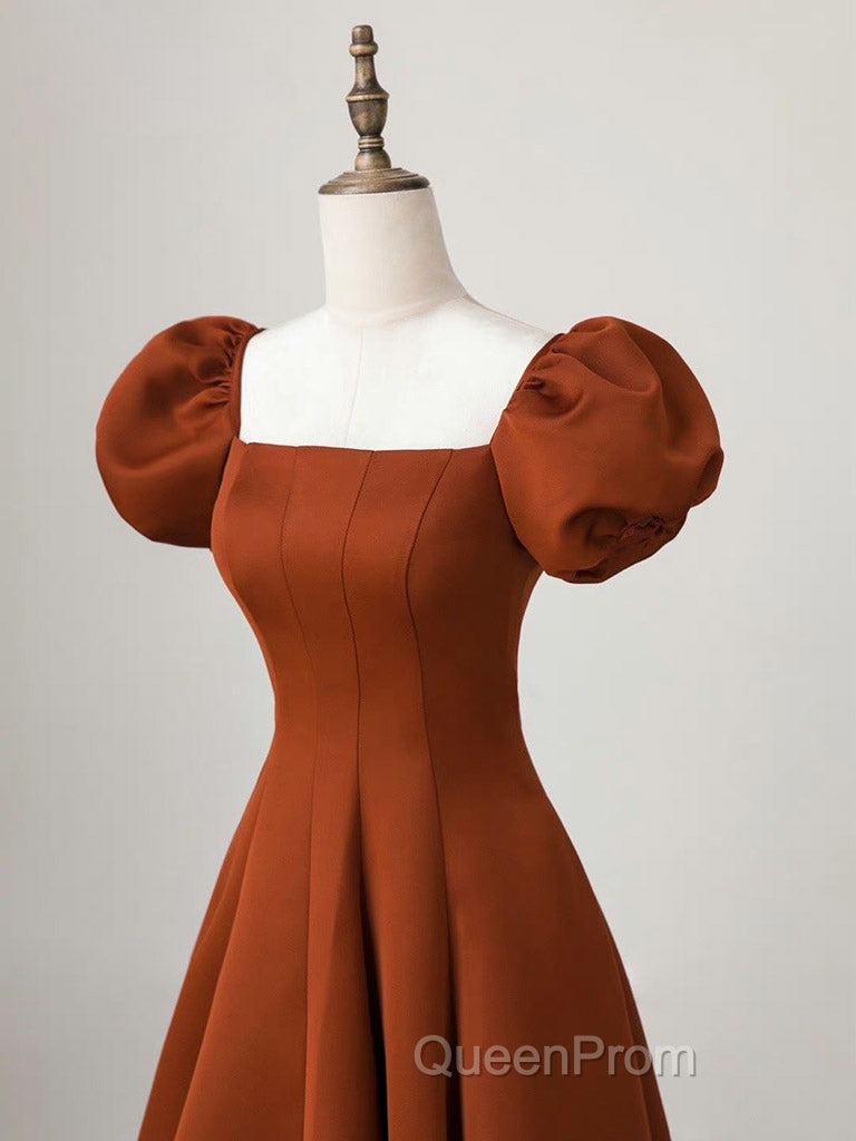 A-Line Puff Sleeves Satin Long Evening Prom Dresses, Long Evening Dresses