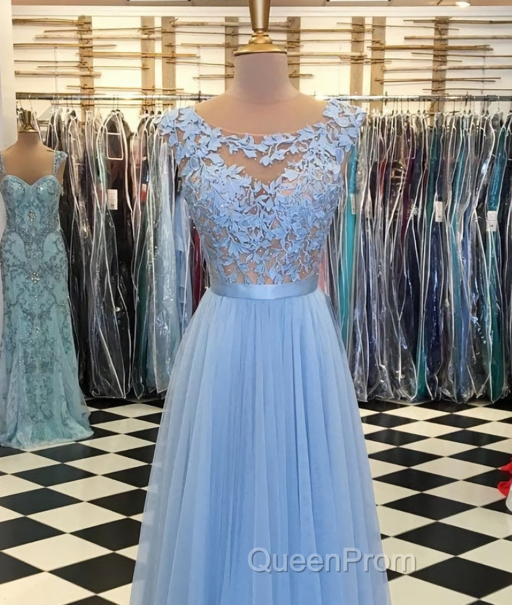 A Line Round Neck Blue Lace Appliques Tulle Long Evening Prom Dresses, Blue Lace Graduation Dresses, Blue Evening Formal Dresses