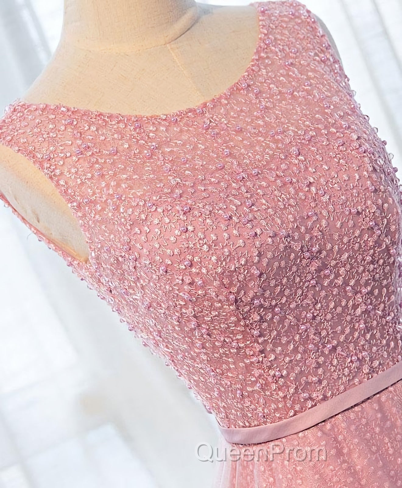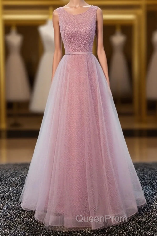 A Line Round Neck Tulle Long Evening Prom Dresses, Lace Evening Dresses