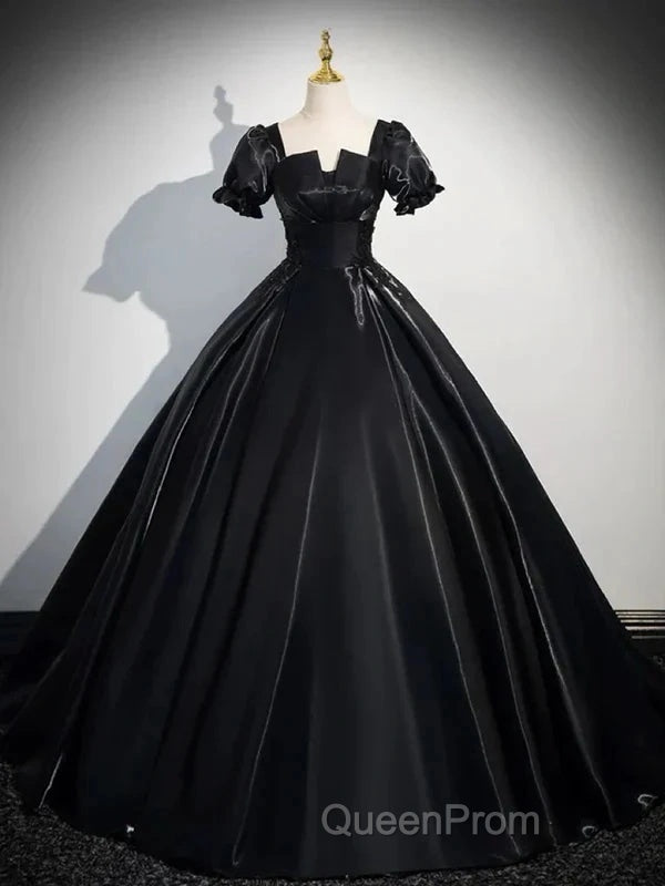 A-Line Satin Black Long Evening Prom Dresses Quinceanera Dresses Short Sleeves Evening Dresses