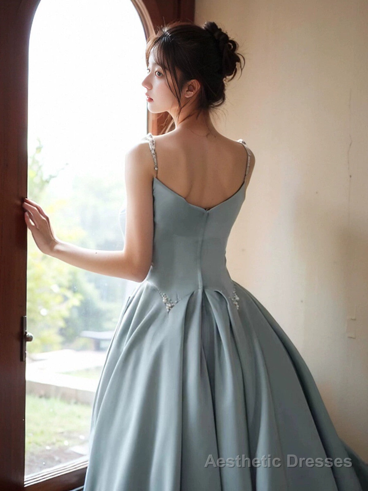 A-line Satin Blue Long Straps Evening Dress, Satin Long Prom Dress