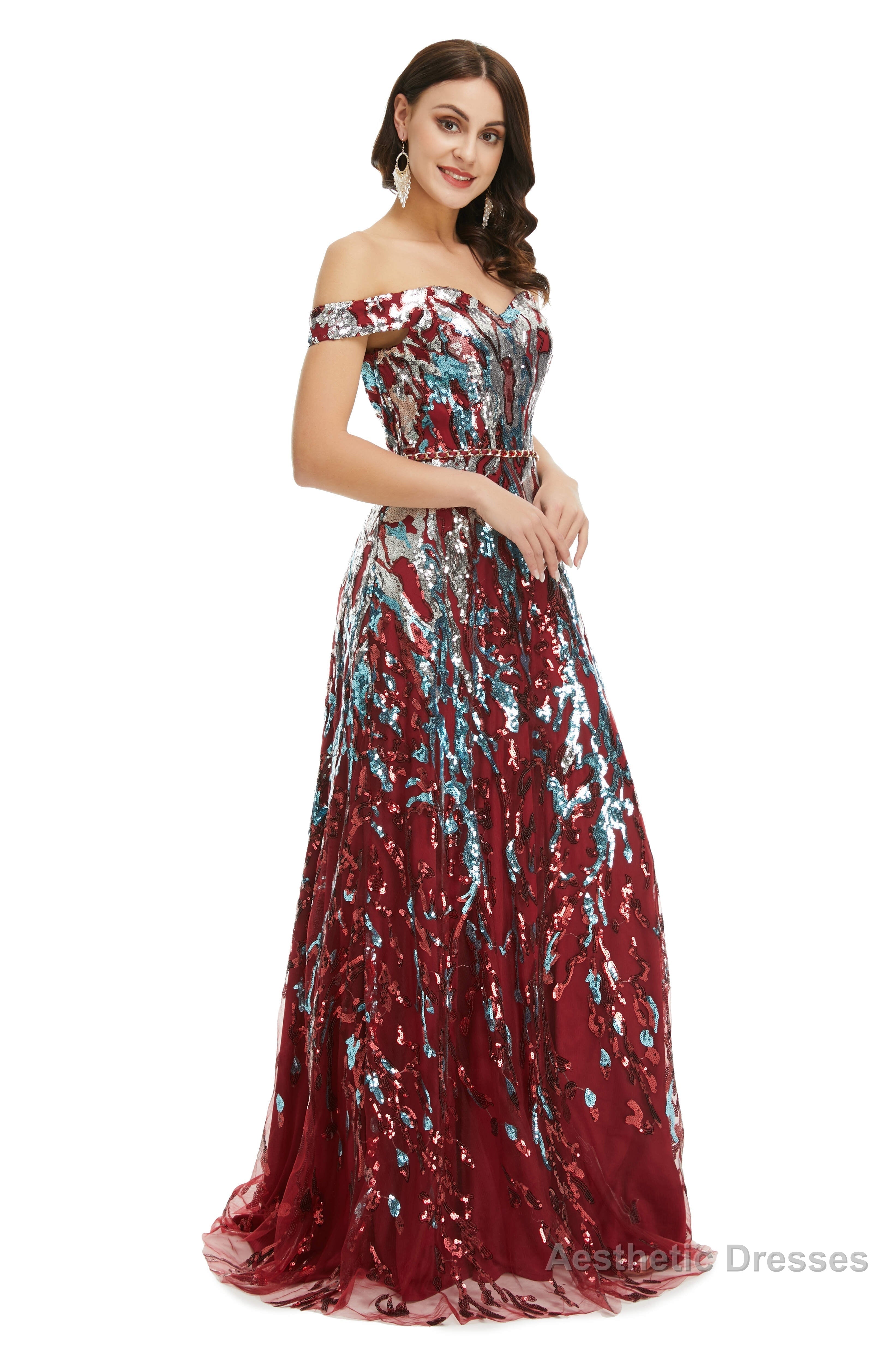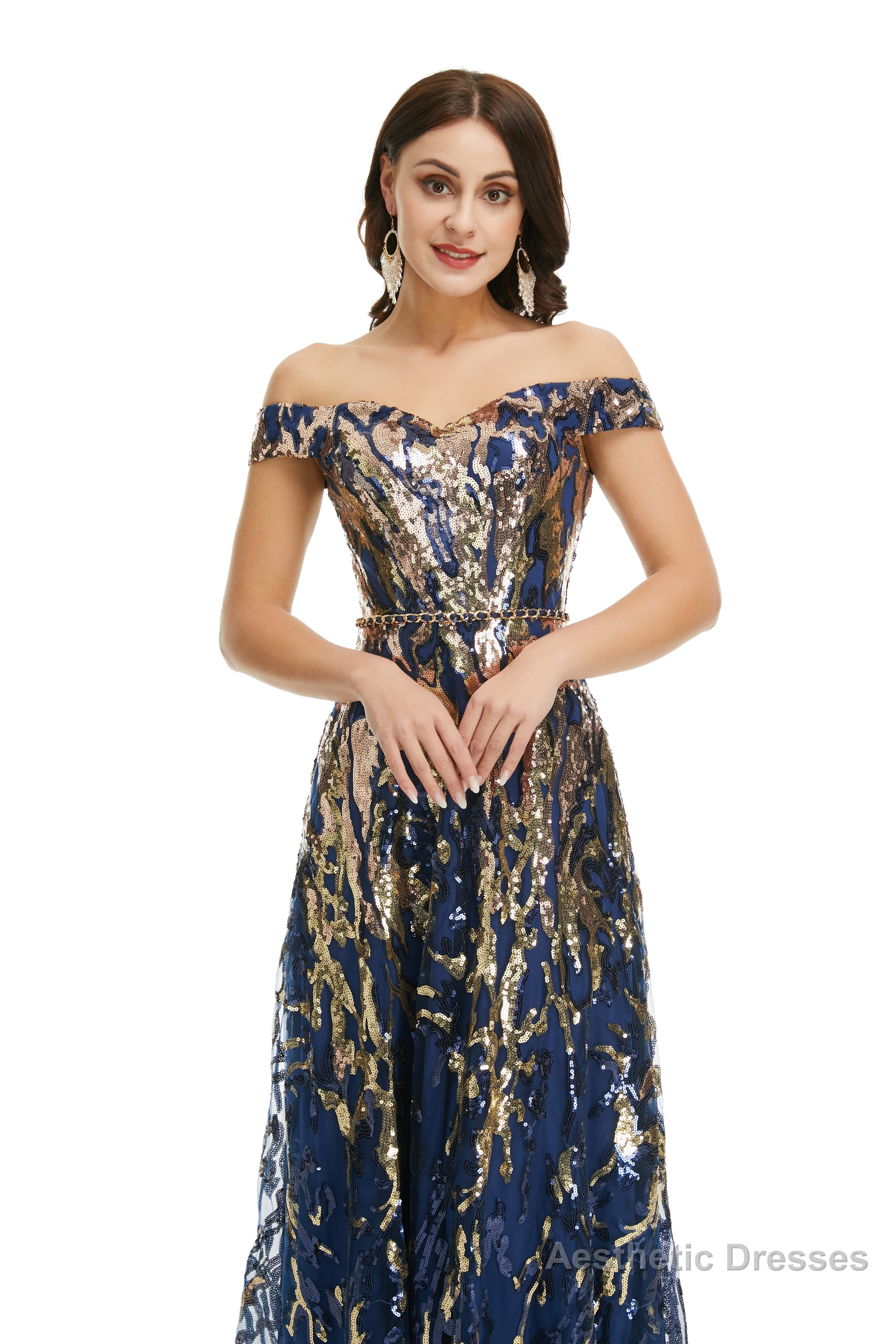 A Line Sequins Off the Shoulder Long Prom Dresses