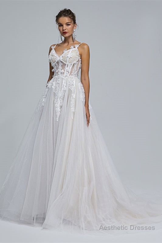 A-Line Spaghetti Strap Sweetheart Tulle Applique Floor-Length Sleeveless Wedding Dresses