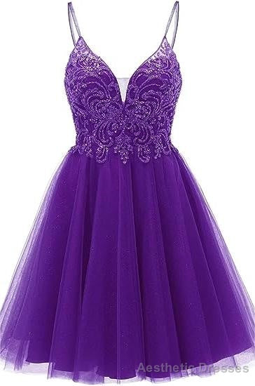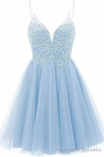 A-line Straps Appliques Tulle Short Homecoming Dresses