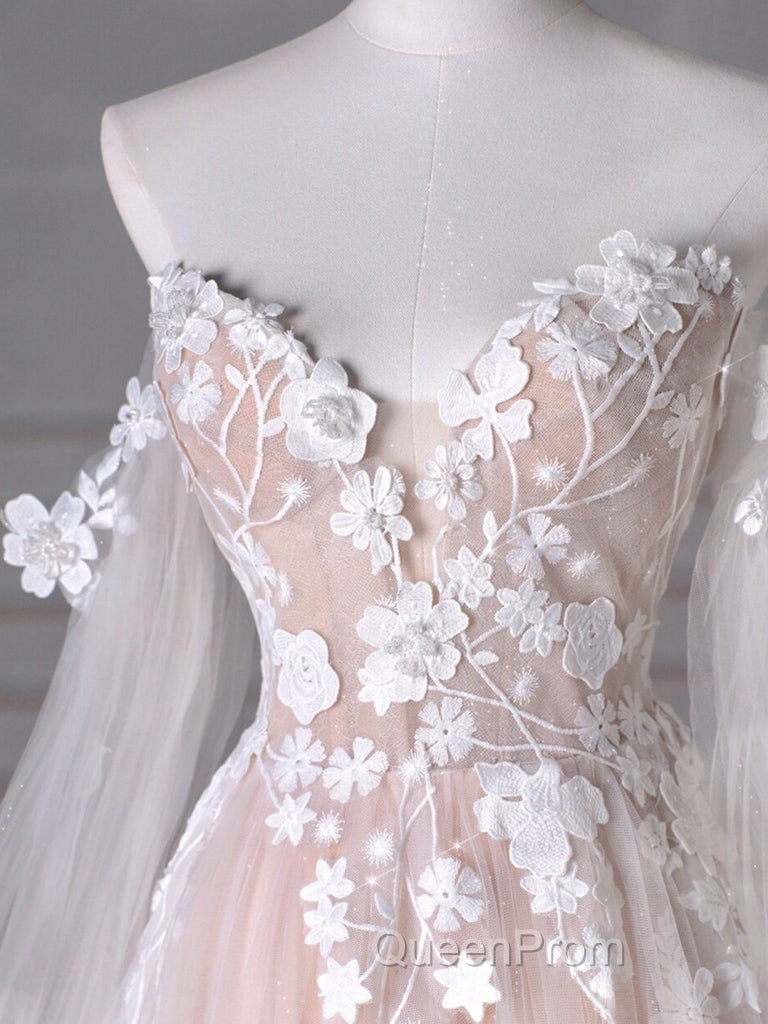 A-Line Sweetheart Neck Long Sleeve Lace Tulle Light Champagne Long Evening Prom Dresses