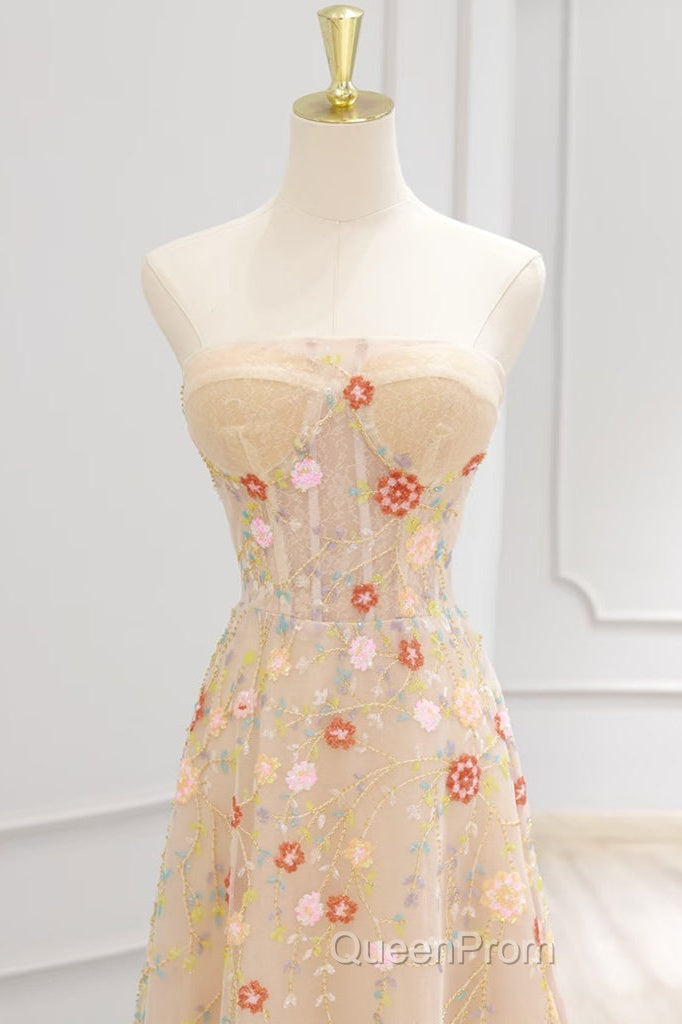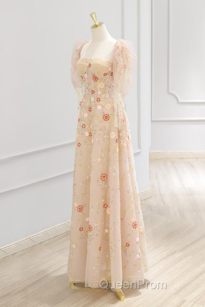 A-Line Tulle Lace Sequin Champagne Long Evening Prom Dresses, Champagne Long Formal Dresses