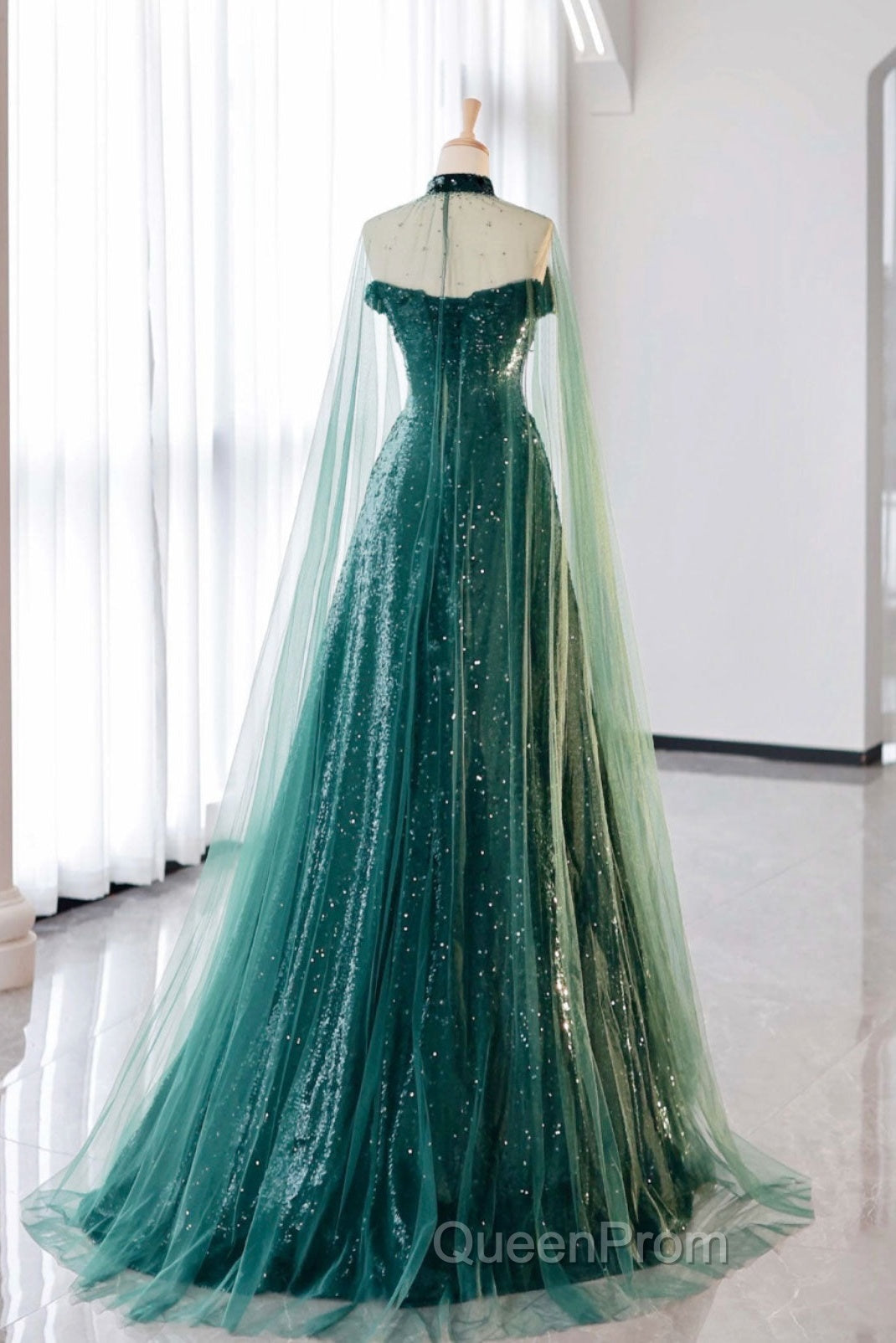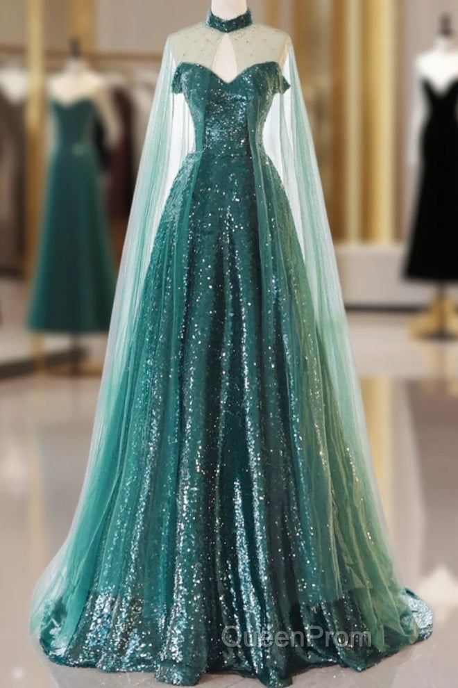 A-Line Tulle Sequin Green Long Evening Prom Dresses, Green Formal Evening Dresses