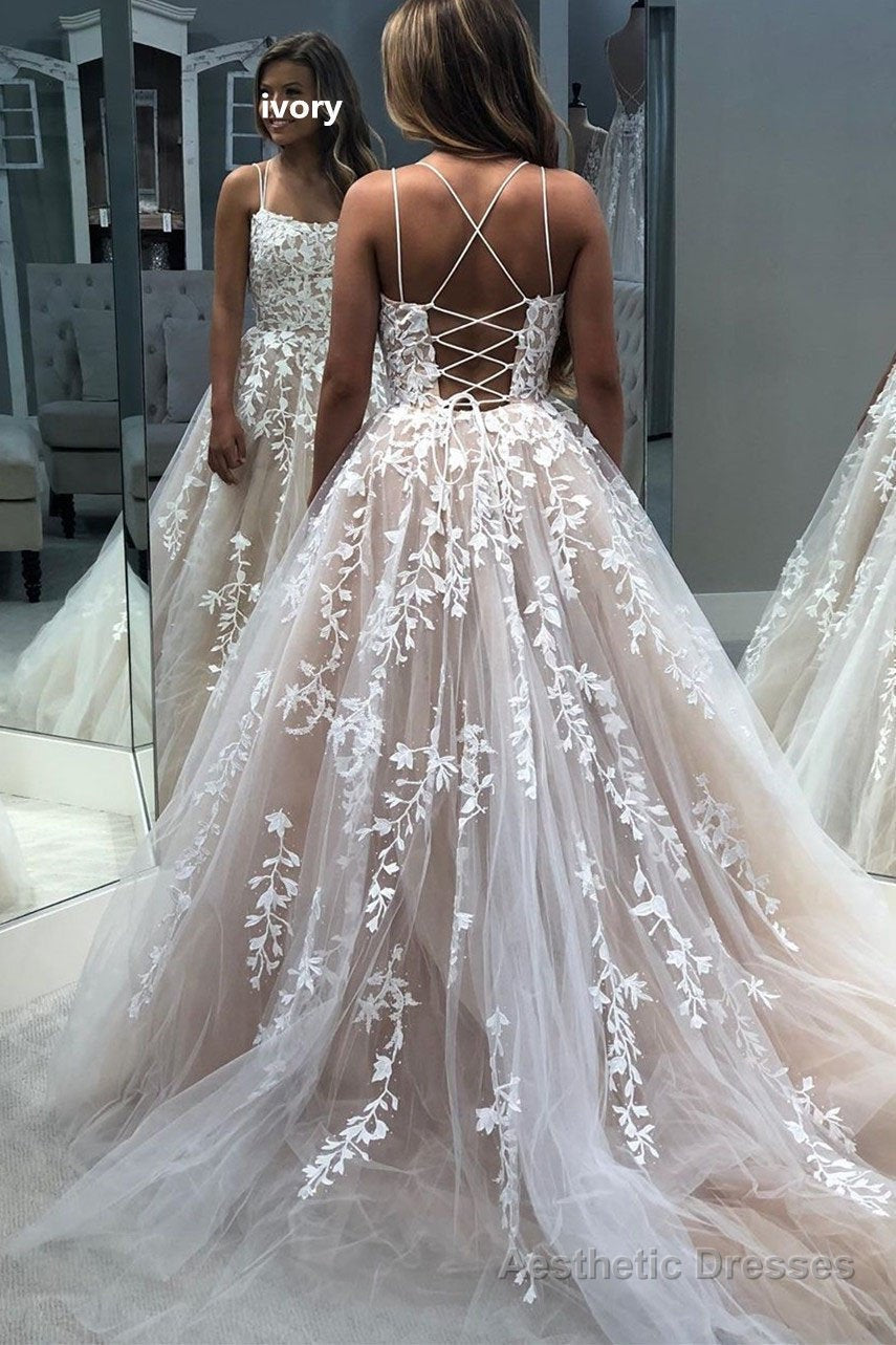 A Line Tulle Yellow Spaghetti Straps Prom Dresses With Appliques Party Dresses