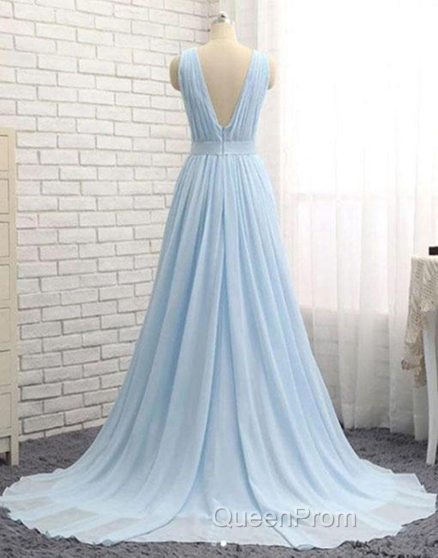 A Line V Neck and V Back Sky Blue Chiffon Long Evening Prom Dresses, V Neck Blue Formal Dresses, Blue Evening Dresses