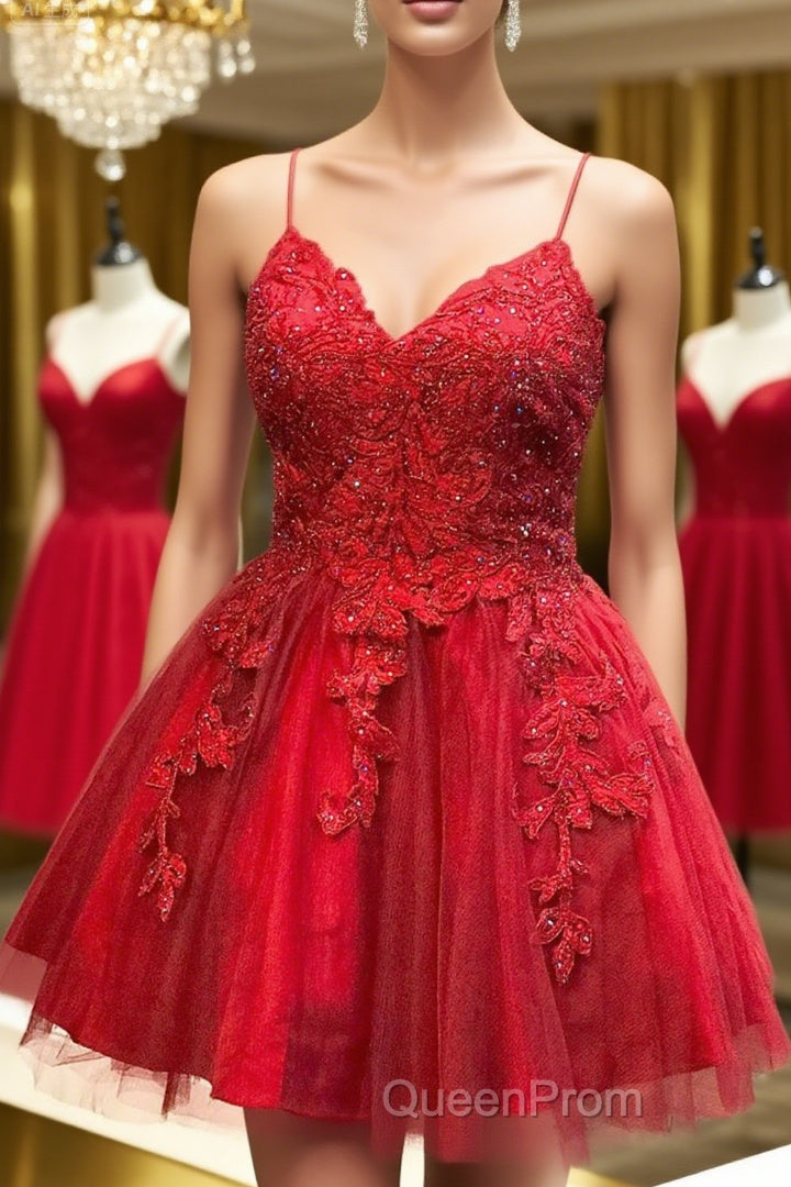 A Line V Neck Backless Lace Red Short Evening Prom Dresses Homecoming Dresses, Backless Red Lace Formal Graduation Evening Dresses
