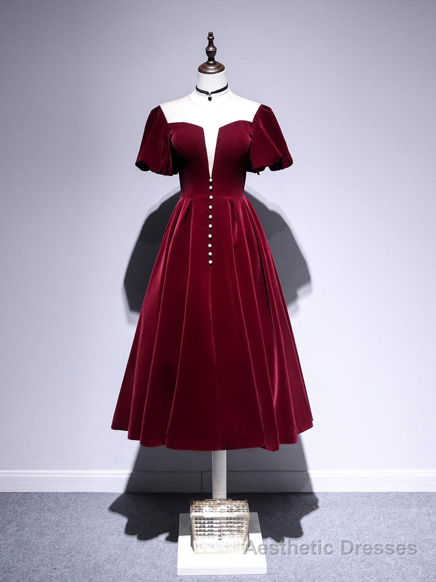 A line Velvet Tea Length Prom Dresses, Burgundy Velvet Bridesmaid Dresses