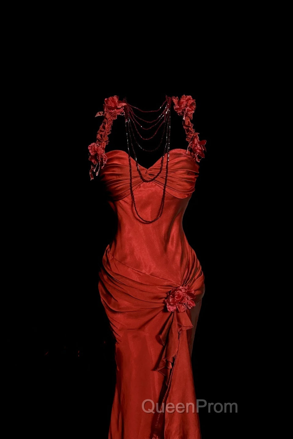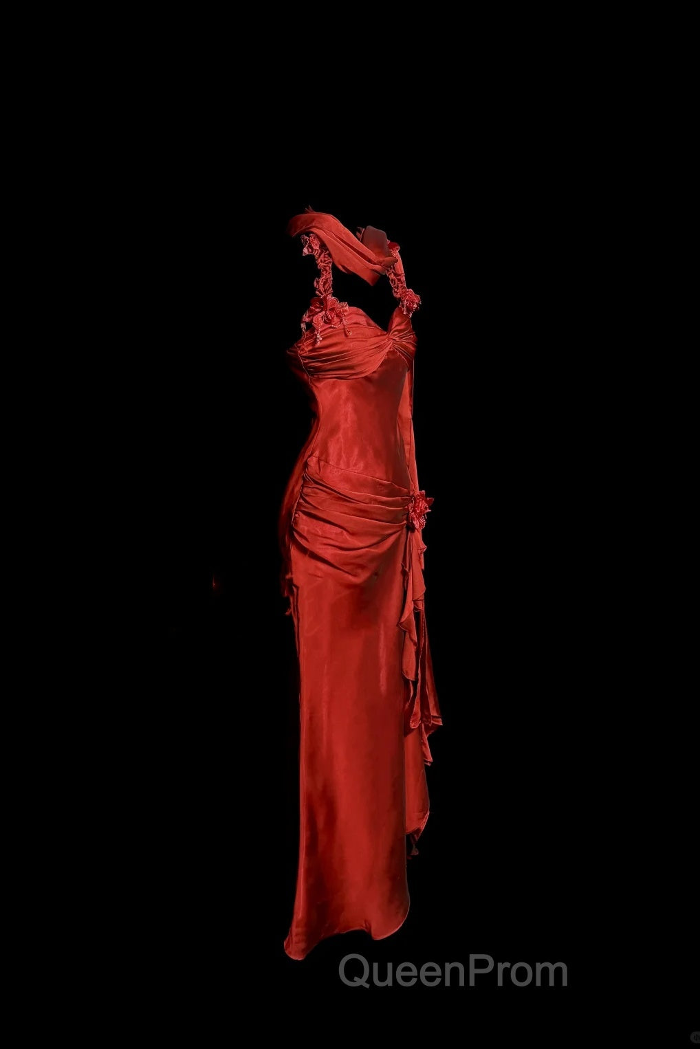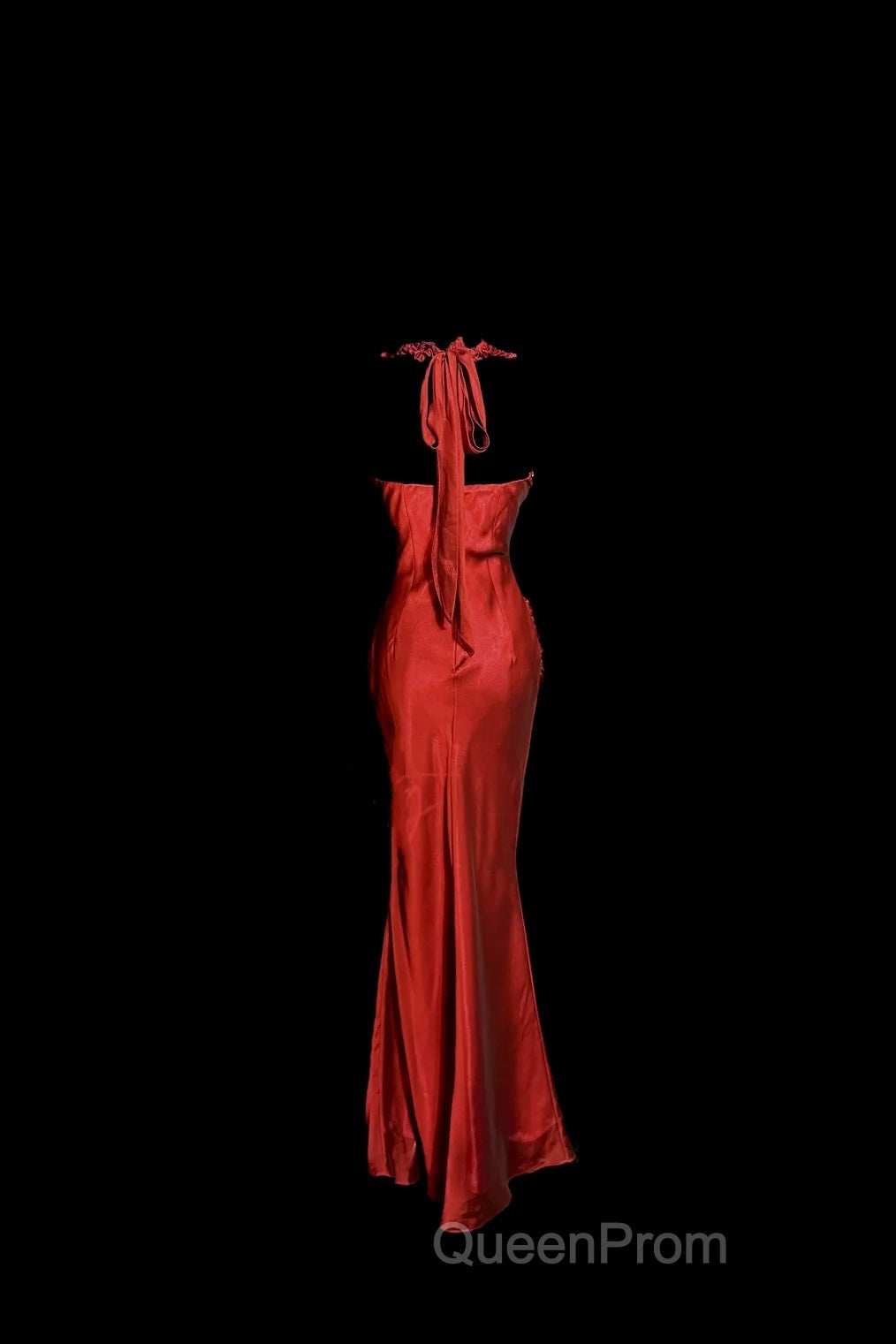 Aesthetic Mermaid Halter Neckline Red Satin Evening Prom Dresses Ruffle Long Party Dresses