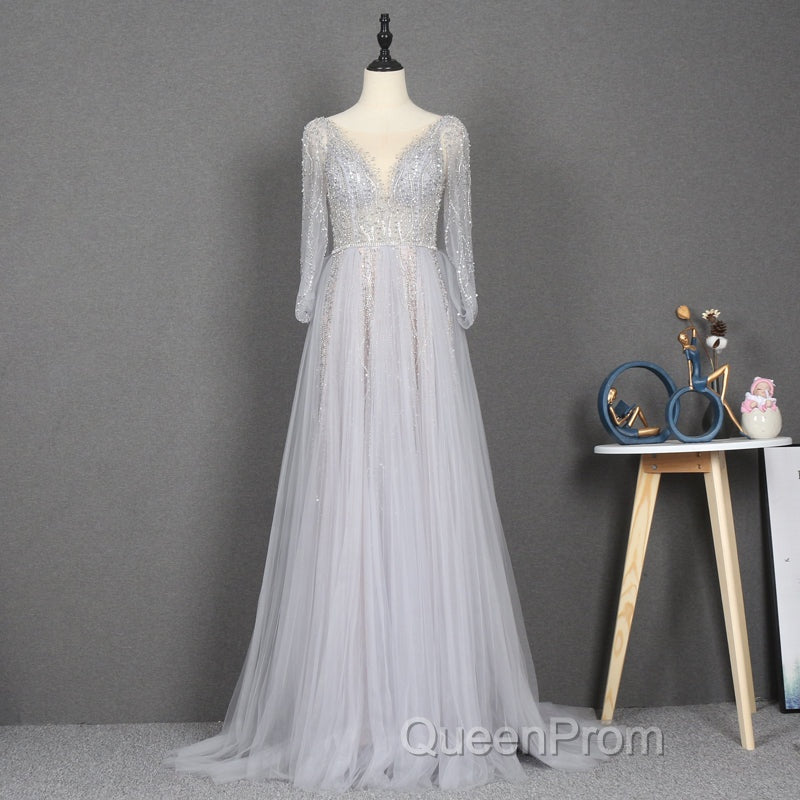 Amazing Long Gray Beading Evening Prom Dresses Modest Evening Gowns