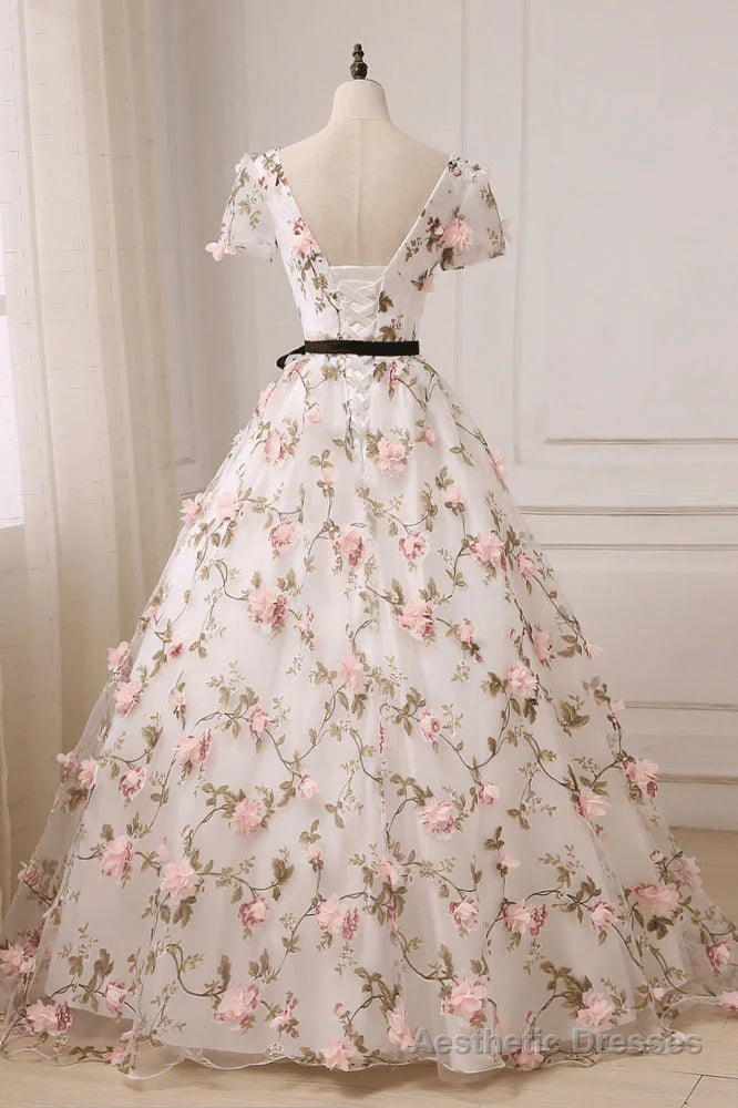 Beauitufl Floral V-Neck Lace Short Sleeve Flowers Long Prom Dress Floral Party Dress prom dresses shops