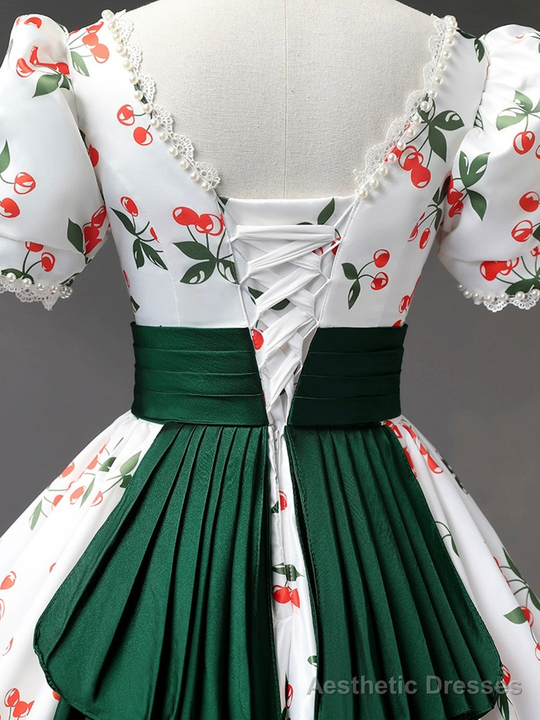 Beautiful Cherry Pattern Long Princess Prom Dress, White A-Line Short Sleeve Evening Party Dress