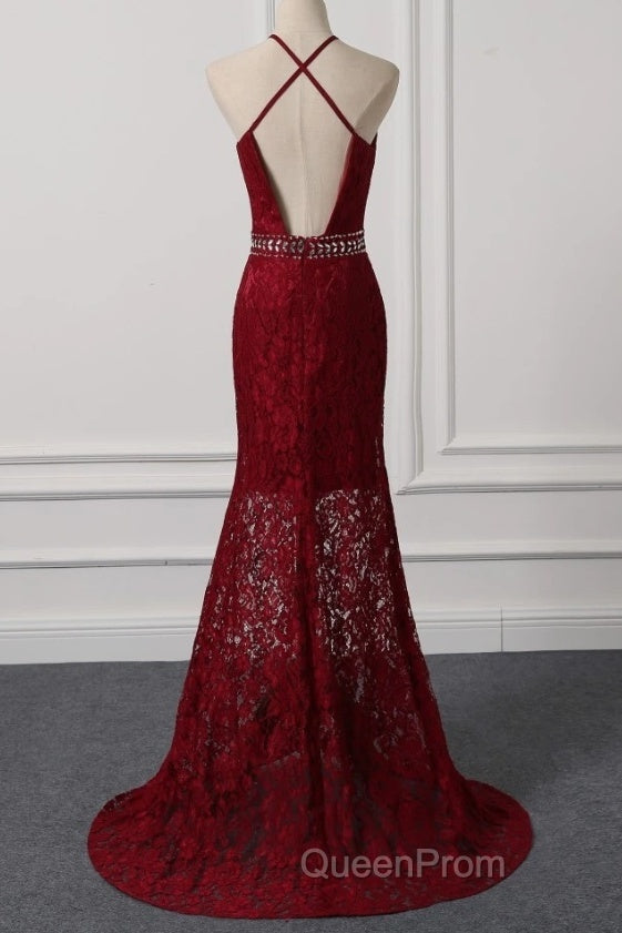 Beautiful Dark Red Lace Halter Beaded Evening Dresses, Mermaid Evening Prom Dresses