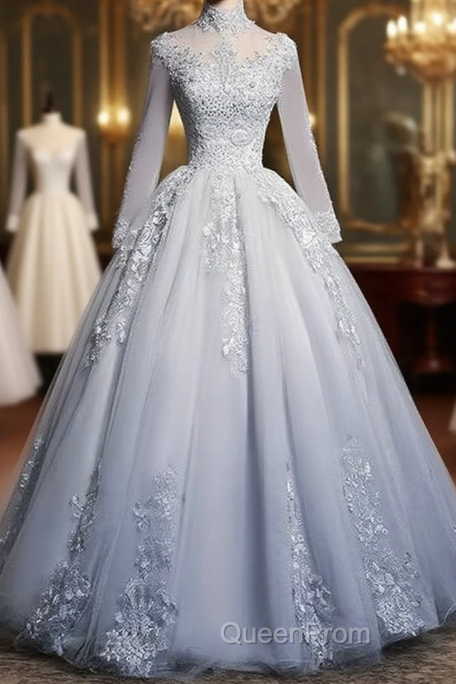 Beautiful Grey A-Line Long Sleeves With Lace Party Gown Sweet 16 Dresses Evening Prom Dresses