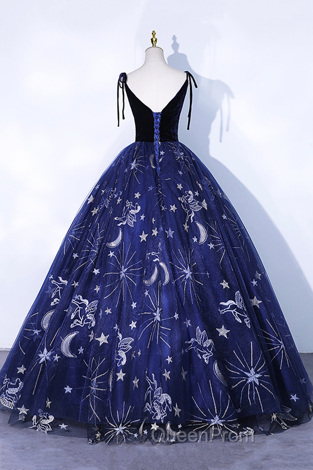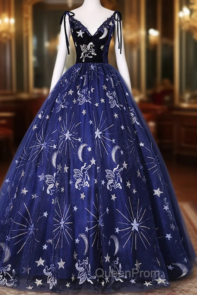 Beautiful Navy Blue Tulle Long Evening Prom Dresses, Spaghetti Straps Lace Flower Backless Formal Dresses