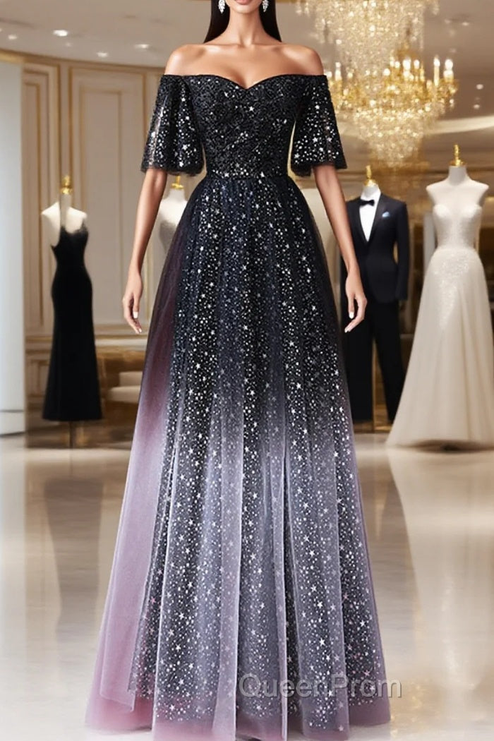 Black A-Line Gradient Tulle Short Sleeves Evening Prom Dresses, Black Long Evening Dresses
