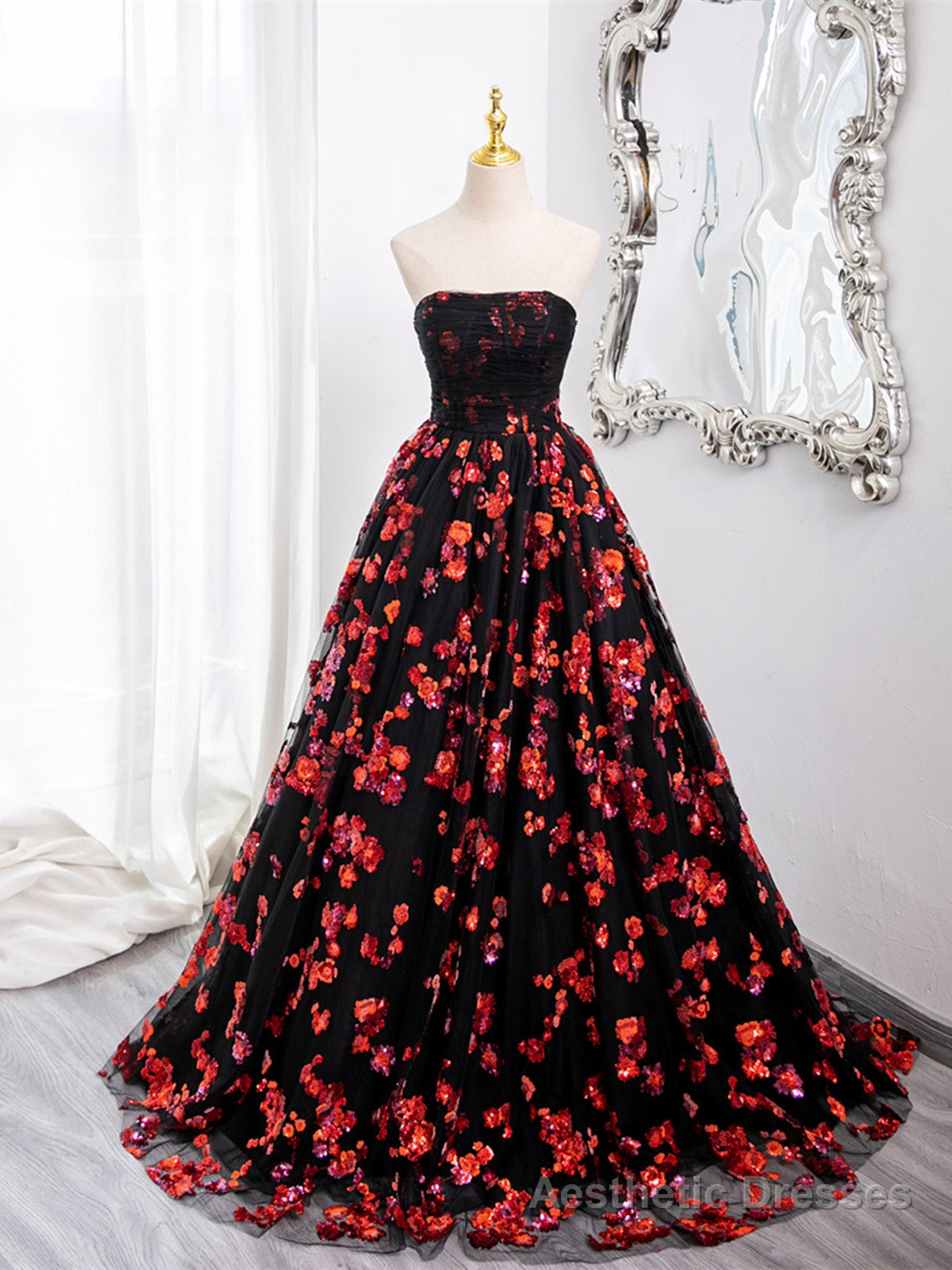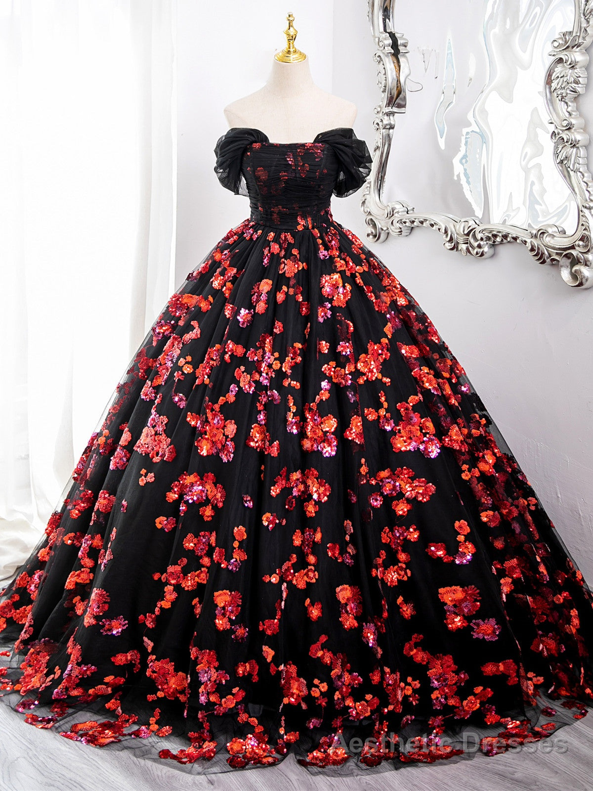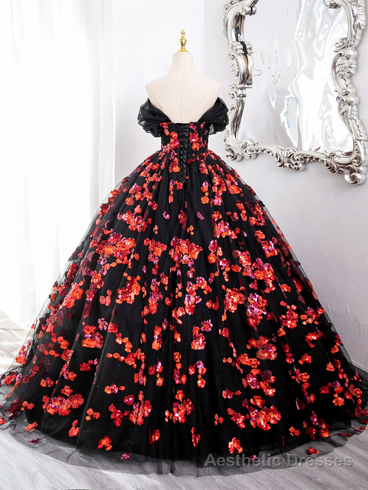 Black and Red Off Shoulder Floral Tulle Formal Dress, Floor Length Party Dress