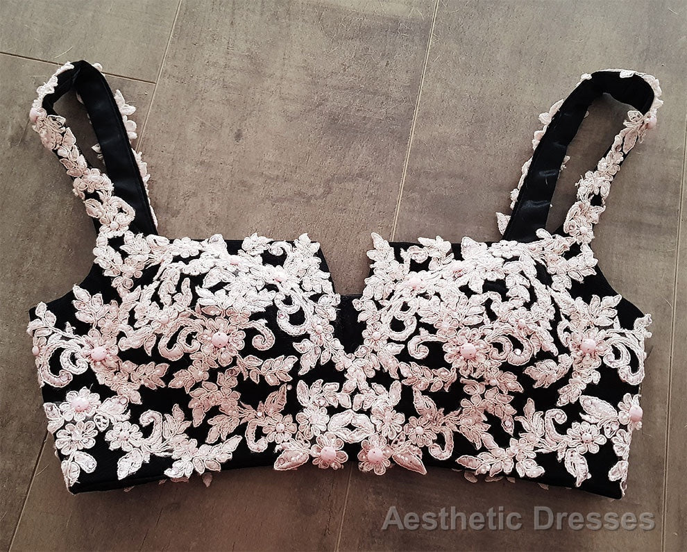 Black Lace Two Pieces Long Prom Dress, Black Evening Dress with Lace Beading
