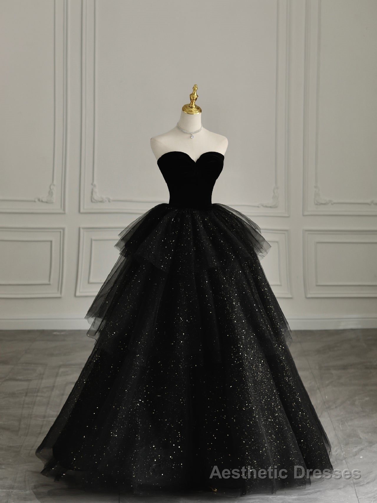 Black Strapless Layered Velvet Tulle Long Prom Dress Evening Dress