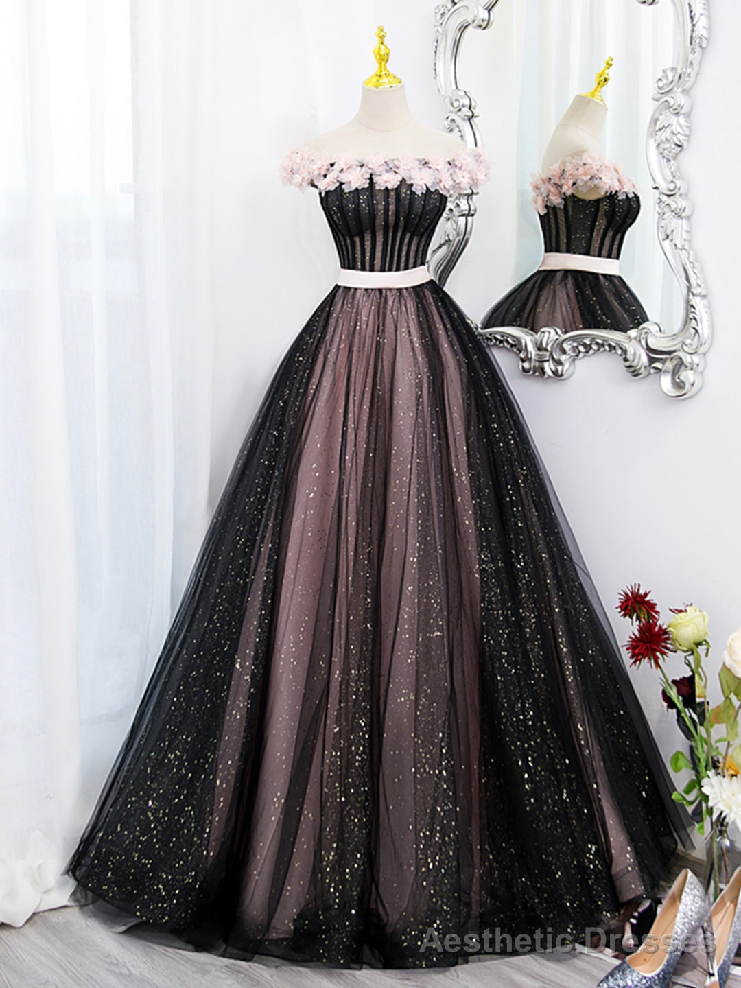 Black Tulle and Pink Flowers Party Dress, Black Off Shoulder Sweet 16 Dress