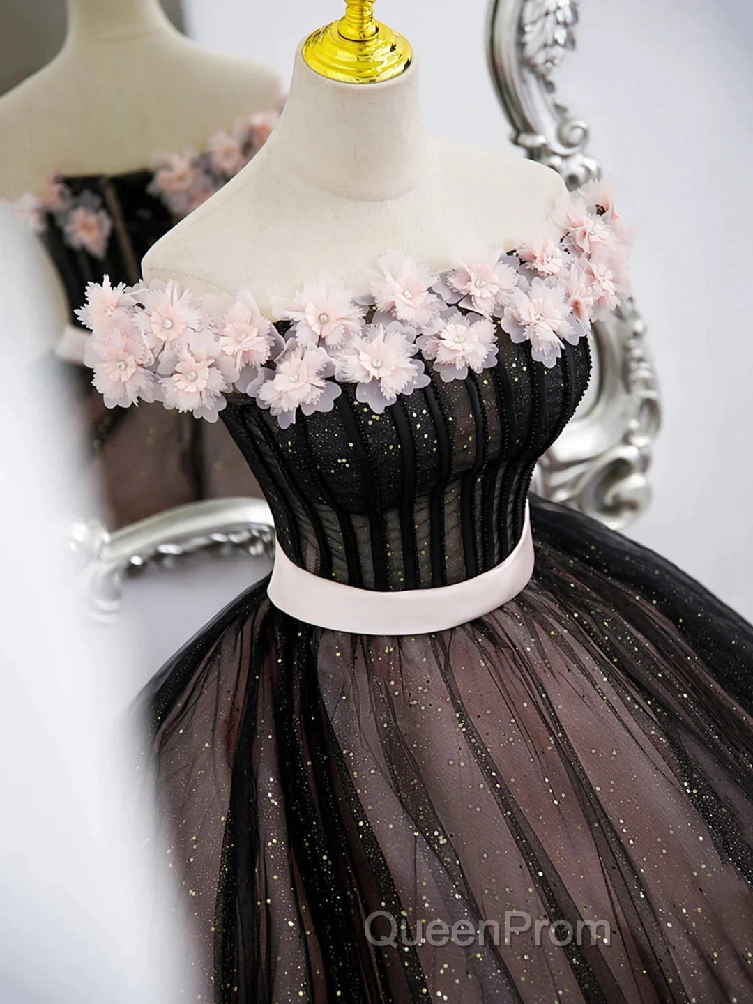 Black Tulle & Pink Flowers Sparkle Evening Prom Dresses