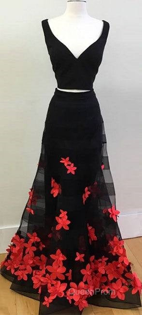 Black Two Pieces Applique Long Evening Prom Dresses, Black Evening Dresses