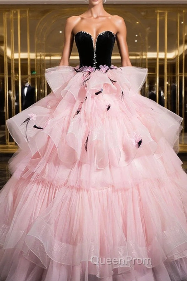 Black Velvet And Pink Tulle Strapless Ball Gown, Pink Backless Ruffles Formal Evening Dresses