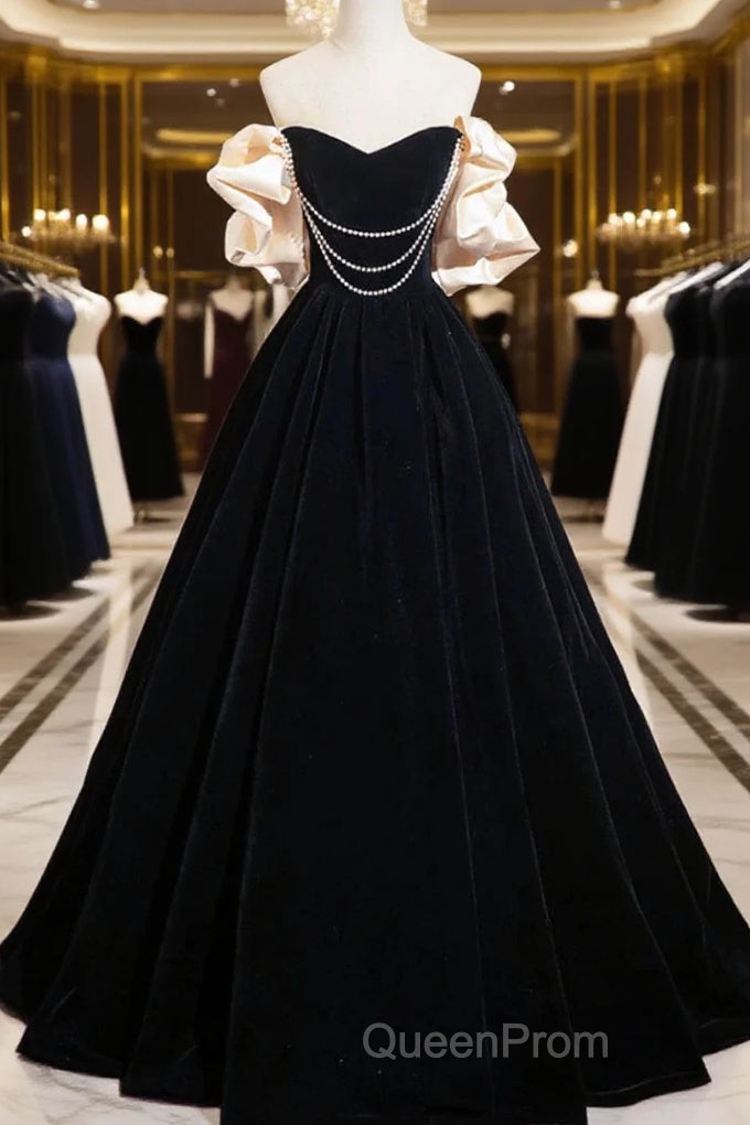 Black Velvet Long A-Line Evening Prom Dresses, Off The Shoulder Evening Party Dresses