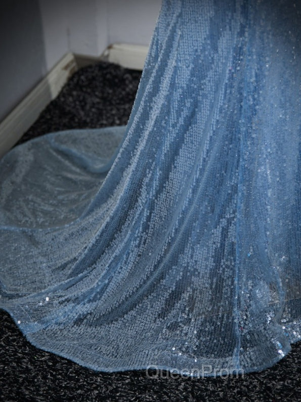 Blue Mermaid Sequin Sheer Straps Scalloped Long Evening Prom Dresses