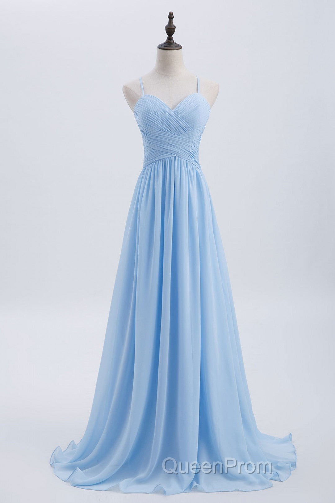 Blue Pleated Straps Chiffon Long Bridesmaid Dresses