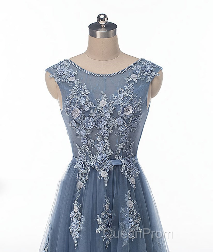 Blue round neck tulle lace applique long Evening Prom Dresses, blue evening Dresses