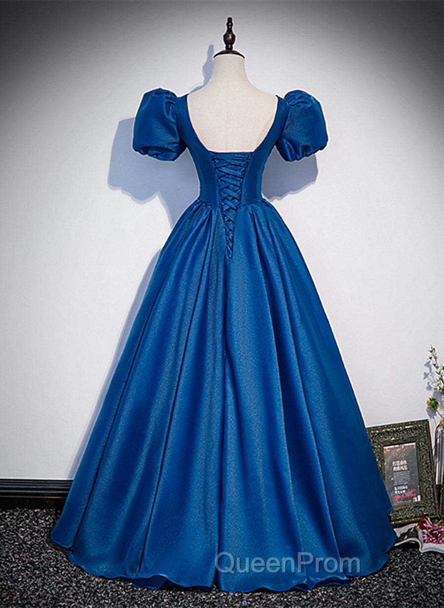 Blue Satin V-Neckline Short Sleeves Long Formal Dresses, Blue Satin Evening Prom Dresses