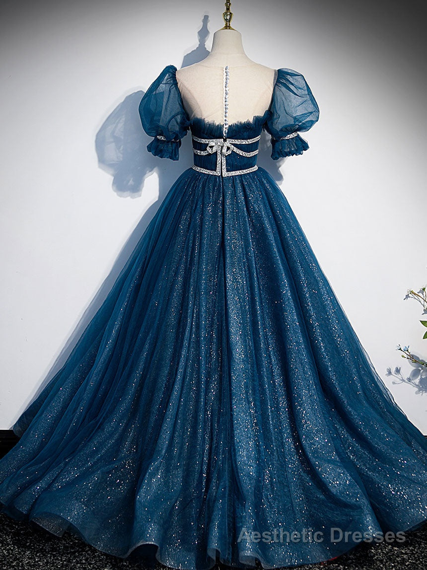 Blue Tulle Off Shoulder Long Prom Dress, Blue Tulle Formal Dress