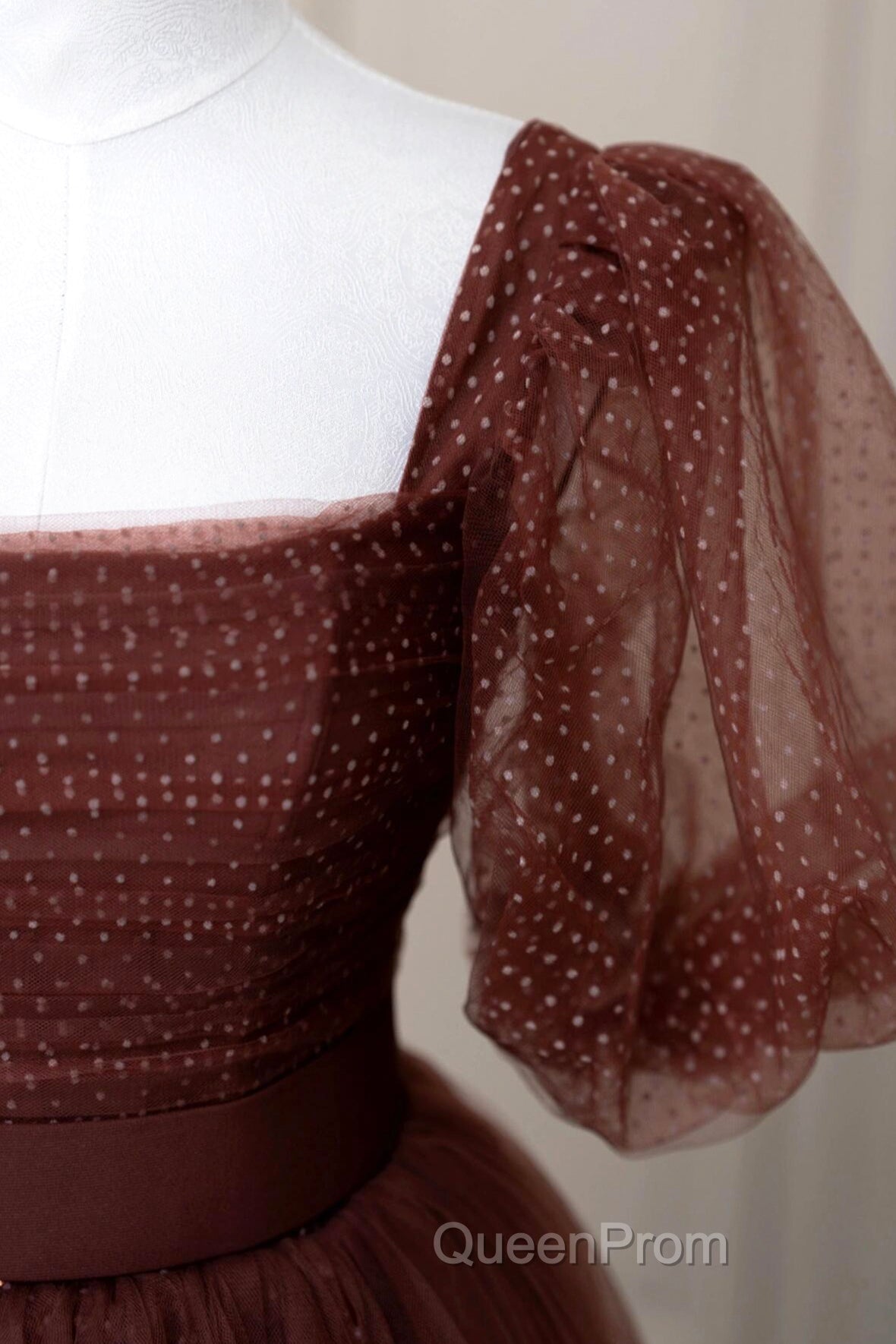 Brown Tulle Floor Length Evening Prom Dresses, A-Line Short Sleeve Evening Party Dresses
