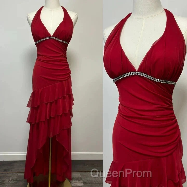 Burgundy A-Line Halter V Neck Chiffon Backless Evening Prom Dresses,Bridesmaid Dresses With Ankle Length
